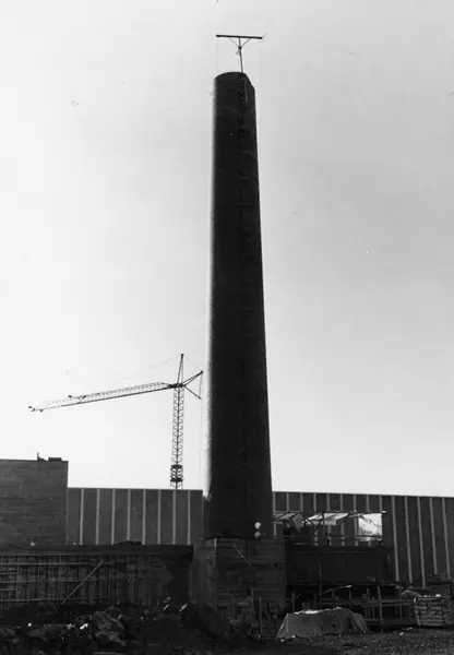 Byggeplass. Konstruksjon av Tiedemanns Tobaksfabrik på Hovin i 1967. Nærbilde på den store pipen på fabrikken.