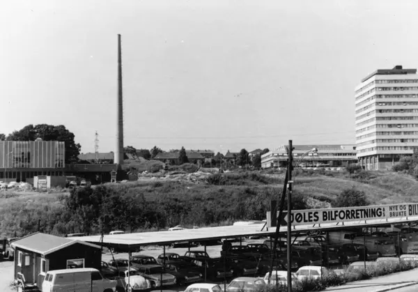 Byggeplass. Konstruksjon av Tiedemanns Tobaksfabrik på Hovin i 1968. Fotografiet viser Kjøles Bilforretning AS med byggeplassen i bakgrunnen.