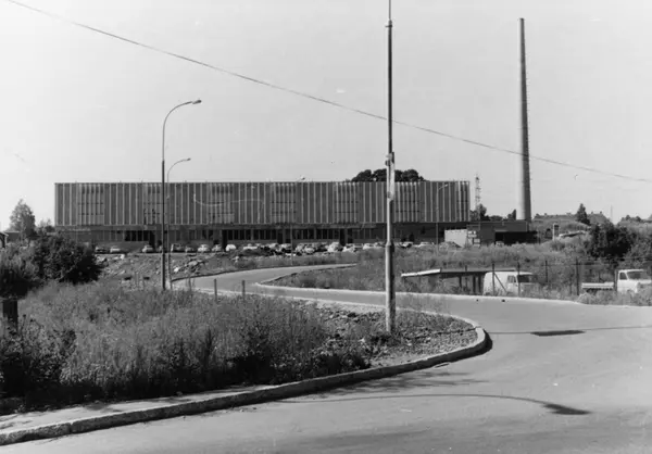 J. L. Tiedemanns Tobaksfabrik på Hovin i 1968. Fabrikken fotografert fra gaten. Bildet ble tatt i forbindelse med konstruksjonen av fabrikken.