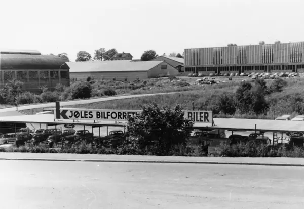 J. L. Tiedemanns Tobaksfabrik på Hovin i 1968. Den nye fabrikken er fotografert med Kjøles Bilforretning i forgrunden. Bildet ble tatt i forbindelse med konstruksjonen av fabrikken.