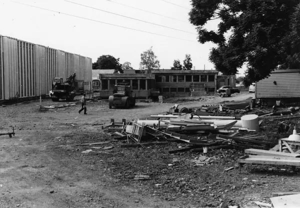 Byggeplass. Konstruksjon av Tiedemanns Tobaksfabrik på Hovin i 1968.