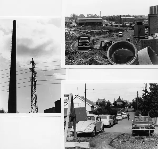 Byggeplass. Konstruksjon av J. L. Tiedemanns Tobaksfabrik på Hovin i 1968. Dette er et montasje av tre fotografier som viser byggeplassen og den store pipen på fabrikken men også en gate utenfor fabrikkområdet med parkerte biler og eneboliger.