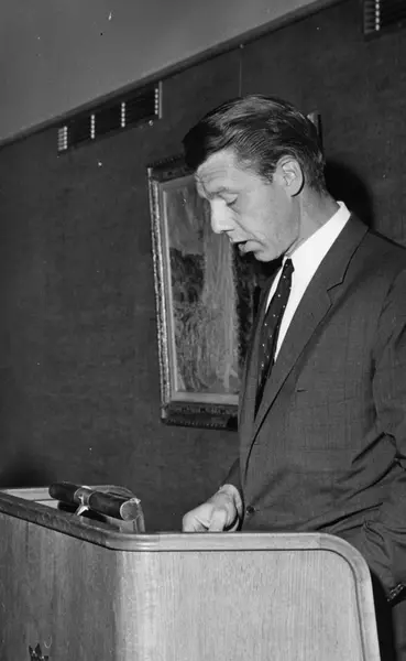 Åpning av J. L. Tiedemanns Tobaksfabrik på Hovin 22.07.1968. Interiørbilde fra spisesalen på den nye fabrikken. Johan Henrik Andresen holder tale for de ansatte.