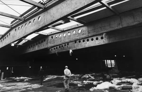 Byggeplass. Konstruksjon av J. L. Tiedemanns Tobaksfabrik på Hovin.