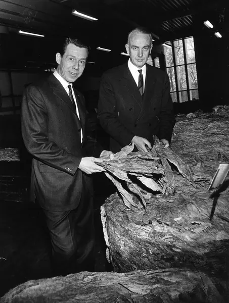 Fabrikkeier Johan Henrik Andresen og Administrerende direktør Tor Seim ser på råtobakk på Tiedemanns nye fabrikk på Hovin i 1968.