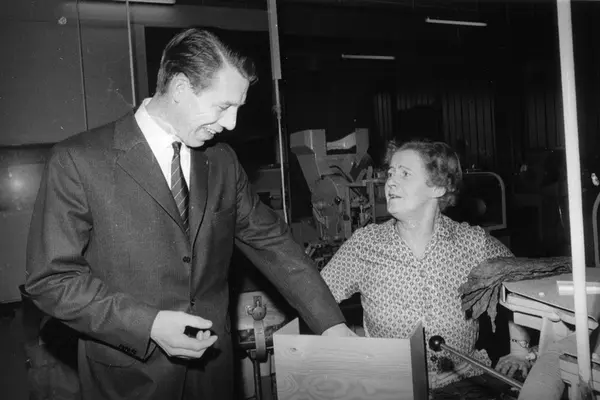 Fabrikkeier Johan Henrik Andresen snakker med en av de ansatte på Tiedemanns nye fabrikk på Hovin i 1968.
