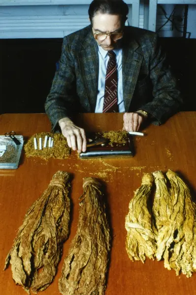 En mann lager håndrullede sigaretter på Tiedemanns fabrikk på Hovin.