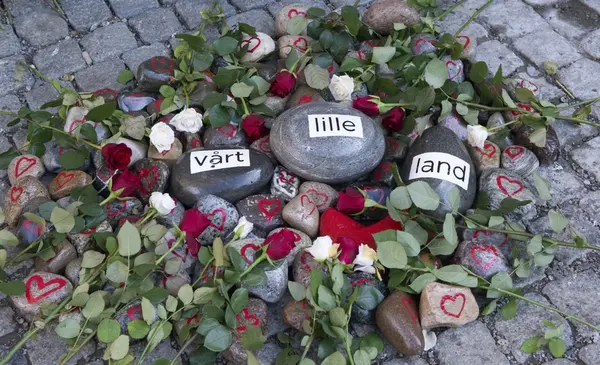 "Sorg i det offentlige rom". Et installasjon av roser og steiner med hjerter og påskriften "Vårt lille land" ved Oslo Domkirke 22.08.2011, en måned etter terrorhandlingene i Oslo og på Utøya.