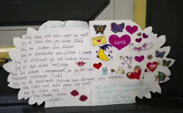 "Sorg i det offentlige rom". Et håndskrevet kort med dikt i Oslo Domkirke 22.08.2011, en måned etter terrorhandlingene i Oslo og på Utøya.
