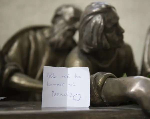 "Sorg i det offentlige rom". Håndskrevet hilsen ved skulptur i Oslo Domkirke 22.08.2011, en måned etter terrorhandlingene i Oslo og på Utøya.