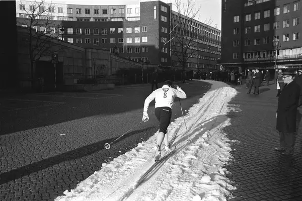 Skiløper i sporet i Borggården ved Oslo Rådhus. Publikum langs løypa. Vikarennet i Oslo. Fotografert november 1965.