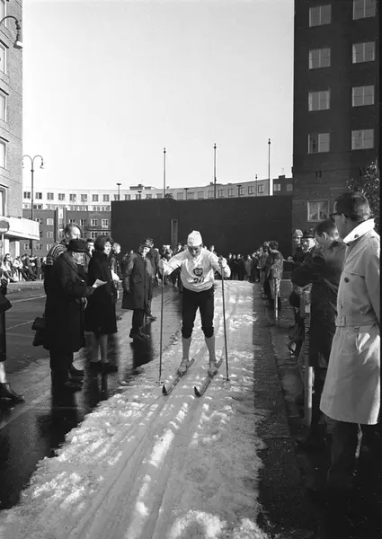 Skiløper Harald Grønningen i sporet ved Oslo Rådhus. Vikarennet i Oslo. Fotografert november 1965.
