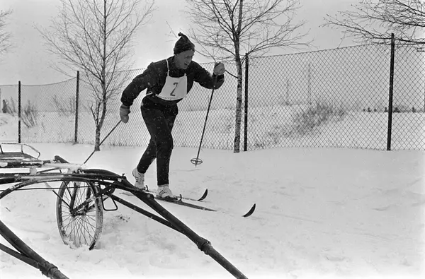 Skiløper med startnummer 2 på brystet i fint driv forbi en parkert sulky på Bjerkebanen. Langrenn på Bjerke Travbane i regi av idrettslaget BUL i desember 1962.