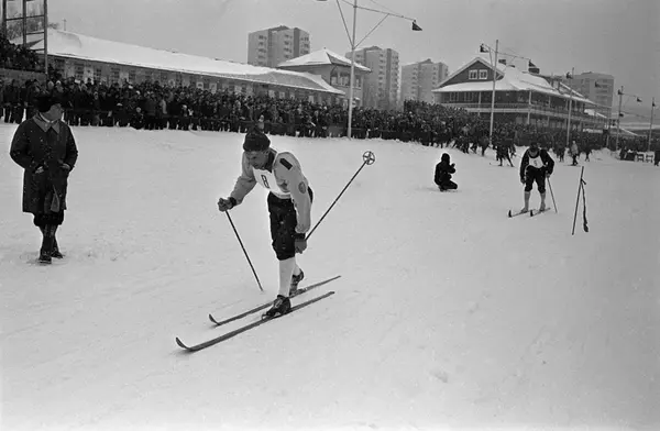 Skiløpere med startnummer 8 og 9 på brystet i fint driv forbi tribunen på Bjerkebanen. Langrenn på Bjerke Travbane i regi av idrettslaget BUL i desember 1962.
