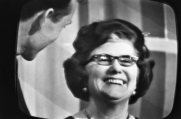 Fra NRKs fjernsynsprogram "Kvitt eller dobbelt" i oktober 1966. Programleder Knut Bjørnsen sammen med en av deltakerne. Avfotografert fra fjernsynet.