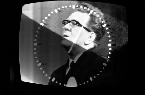 Fra NRKs fjernsynsprogram "Kvitt eller dobbelt" i oktober 1966. En av deltakerne har fått ett minutts betenkningstid i tenkeboksen. Klokken tikker på tv-skjermen. Avfotografert fra fjernsynet.