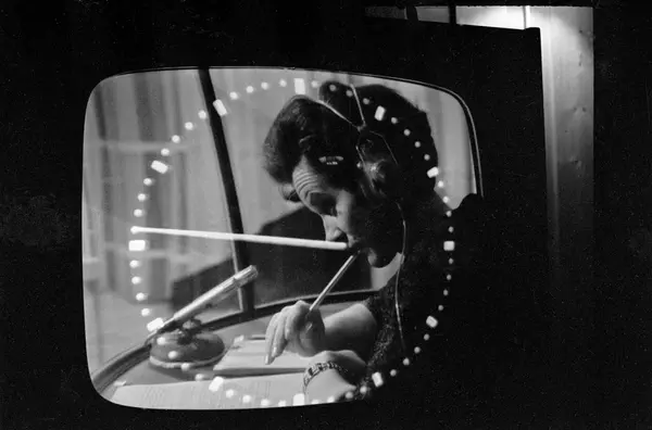 Fra NRKs fjernsynsprogram "Kvitt eller dobbelt" i desember 1966. En av deltakerne har fått ett minutts betenkningstid i tenkeboksen. Klokken tikker på tv-skjermen. Avfotografert fra fjernsynet.