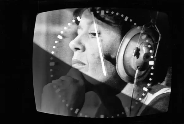 Fra NRKs fjernsynsprogram "Kvitt eller dobbelt" i desember 1966. En av deltakerne har fått ett minutts betenkningstid i tenkeboksen. Klokken tikker på tv-skjermen. Avfotografert fra fjernsynet.