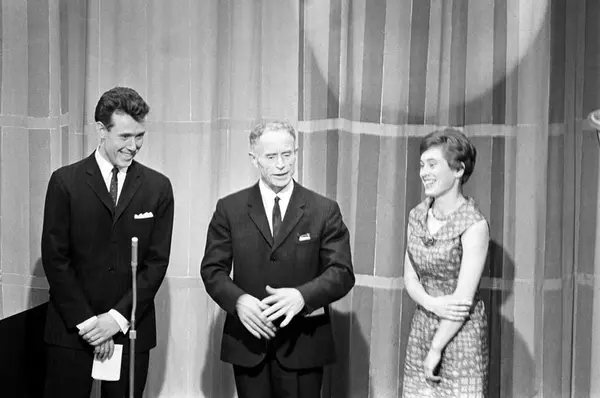 Fra NRKs fjernsynsprogram "Kvitt eller dobbelt" i desember 1966. Programleder Knut Bjørnsen til venstre sammen med deltaker Per Lønning som svarer på spørsmål i emnet "1001 natt". TV-vertinnen til høyre. Avfotografert fra fjernsynet.