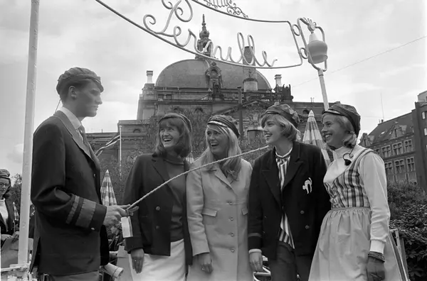 Russen viser russemoter utenfor uterestauranten Pernille i Oslo i mai 1965. Antatt russepresident til venstre og russeprinsesse nummer to fra høyre. Nationaltheatret skimtes i bakgrunnen.