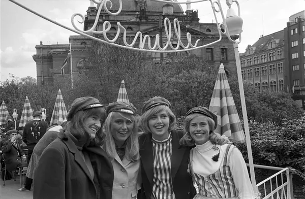 Russen viser russemoter utenfor uterestauranten Pernille i Oslo i mai 1965. Antatt russeprinsesse nummer to fra høyre. Nationaltheatret skimtes i bakgrunnen.