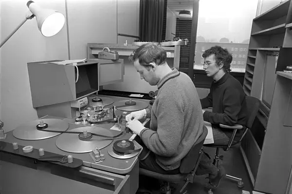 To menn i arbeid ved klippebord i NRK fjernsynet i februar 1970. På bildet fra v. Knut Hanssen, klipper. Kalle Fürst, regissør.