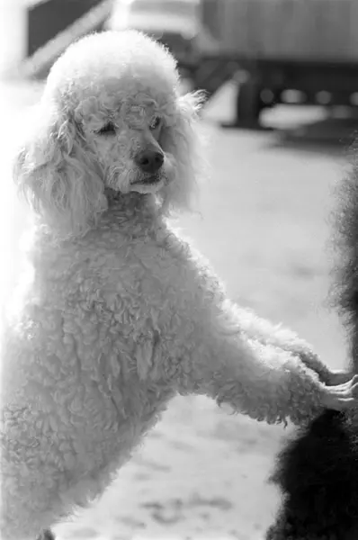 En puddel i en rekke står på to ben etter en liten vogn. Sirkus Schumann viser ett av sirkusnumrene med pudler under sitt besøk på Sjølyst i Oslo i april 1965.