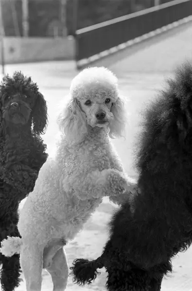 Pudler på rekke og rad står på to ben etter en liten vogn. Sirkus Schumann viser ett av sirkusnumrene med pudler under sitt besøk på Sjølyst i Oslo i april 1965.