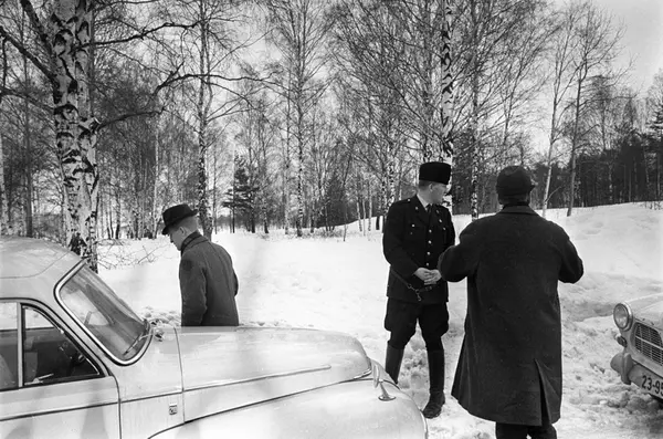 Politietterforskere på åstedsbefaring. Politiet ettersøker en voldsforbryter i skogsområdet rundt Brannfjell i februar 1961. Politibilen er en Volvo Amazon stasjonsvogn.