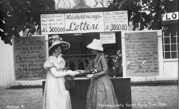 Postkort. Bod med lotterisalg. Norsk Folkemuseums St. Hansfest 1916.