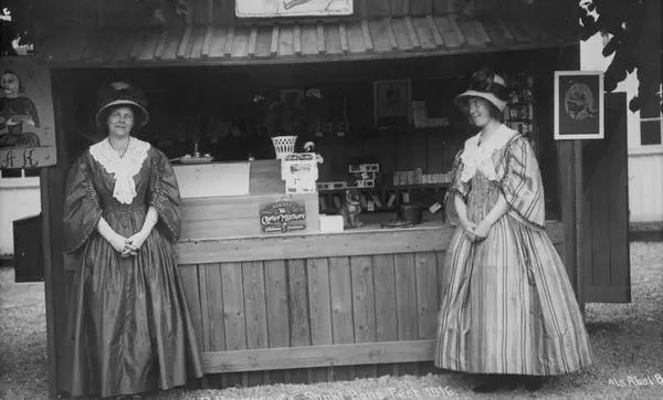 Postkort. Kvinner foran markedsbod hvor det selges tobakk. Norsk Folkemuseums St. Hansfest 1916.