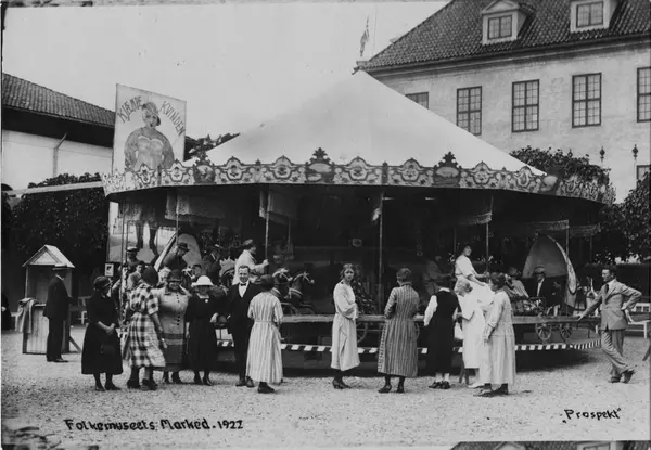 Postkort. Marked på Norsk Folkemuseum i 1922. Karusell på museets torg. Skilt med påskriften "Kjæmpekvinden".