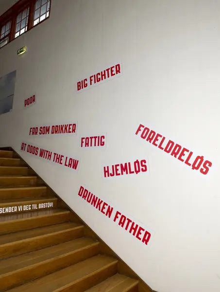 Trappeløp med ord knyttet til barna som havnet på skolehjem. Fra utstillingen om Bastøy skolehjem på Norsk Folkemuseum. Utstillingen stod i perioden 15.12.2010 til 31.12.2011.