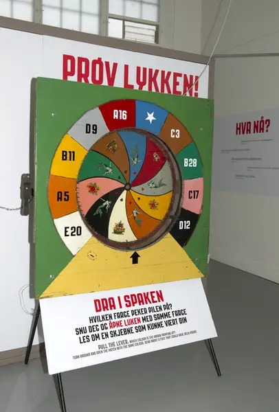 Lykkehjul. Hver farge henviser til en luke på veggen hvor man kan lese om bakgrunnshistoriene til noen av barna som ble sendt på skolehjem. Formidlingsgrep i utstillingen om Bastøy skolehjem på Norsk Folkemuseum. Utstillingen stod i perioden 15.12.2010 til 31.12.2011.