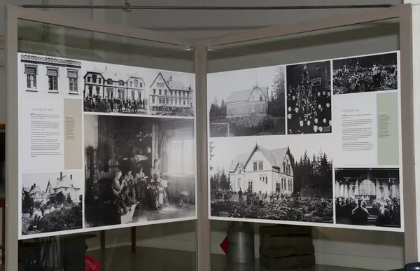 Utstillingsplakater med tekst og skolehjemsbilder. Fra utstillingen om Bastøy skolehjem på Norsk Folkemuseum. Utstillingen stod i perioden 15.12.2010 til 31.12.2011.