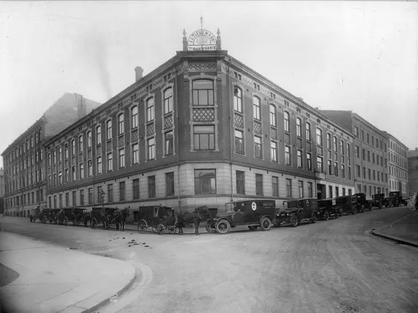 Hestevogner og biler fra Tiedemanns er parkert utenfor fabrikken i Stensberggata infor jubileet 1928.