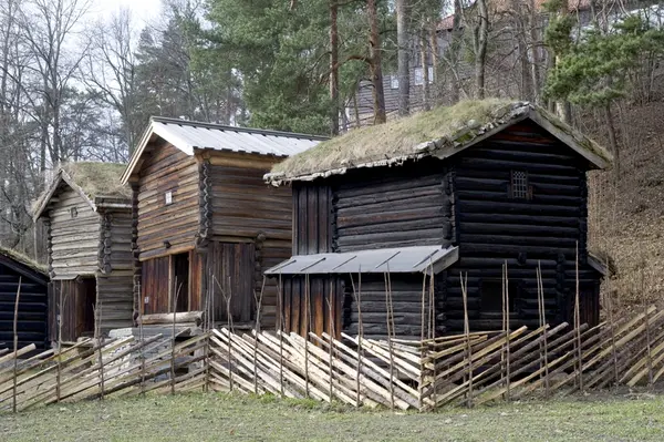 Bygninger i Østerdalstunet. Stabbur fra Murud i Elverum, stabbur fra Simenstua i Stor-Elvdal og loft fra Kilde i Åmot. Fotografert på Norsk Folkemuseum 26. mars 2012.