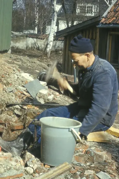 Arbeid ved bebyggelsen fra Enerhaugen på Norsk Folkemuseum. Antakelig i forbindelse med oppføring av vannposten fra Flisberget. Fotografert 1971.