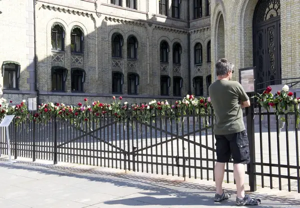 Utenfor Stortinget. Blomster og kondolanser lagt ned i Oslo sentrum i forbindelse med ettårsdagen for terrorhandlingene i Oslo og på Utøya.