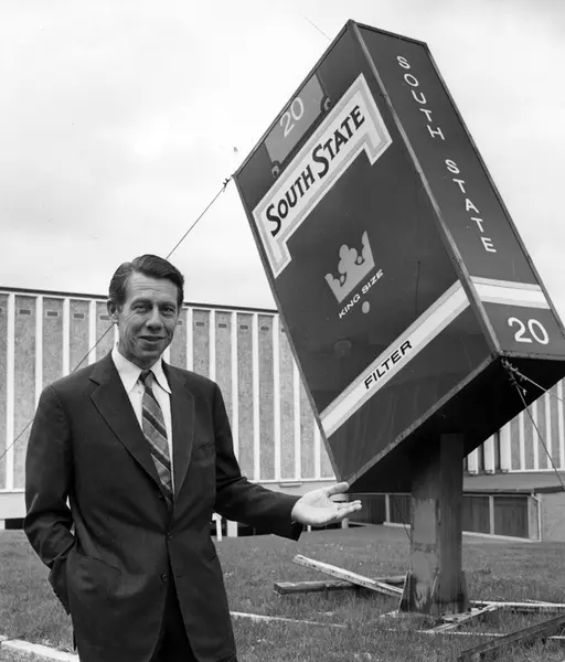 Portrett av Johan Henrik Andresen fremfor en reklameskilt i form av en South State sigarettpakke.
