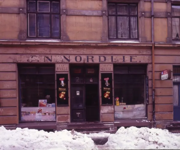 Eksteriør, Johan N. Nordlies kolonialforretning, Vibes gate 13, Oslo. Fotografert i 1968 før ny eier overtok. Butikken ble innredet i ca. 1900, kjøpt av Nordlie i 1921 og solgt til Johan Skarpholt i 1968. Det meste av inventaret ble kjøpt av Norsk Folkemuseum i 1968.