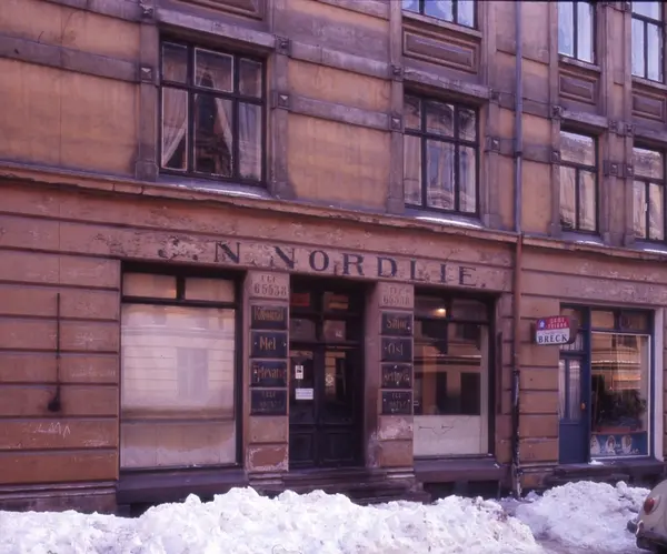 Eksteriør, Johan N. Nordlies kolonialforretning, Vibes gate 13, Oslo. Fotografert i 1968 før ny eier overtok. Butikken ble innredet i ca. 1900, kjøpt av Nordlie i 1921 og solgt til Johan Skarpholt i 1968. Det meste av inventaret ble kjøpt av Norsk Folkemuseum i 1968.