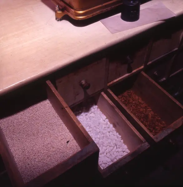 Detalj, skuffer med gryn, sukkerbiter og mandler i butikkinteriør. Johan N. Nordlies kolonialforretning, Vibes gate 13, Oslo, fotografert i 1968 før ny eier overtok. Butikken ble innredet i ca. 1900, kjøpt av Nordlie i 1921 og solgt til Johan Skarpholt i 1968. Det meste av inventaret ble kjøpt av Norsk Folkemuseum i 1968.