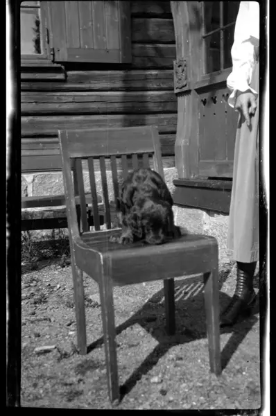 Hunden Rollo på en stol utenfor Villa Knyggen i Voksenlia, Oslo. Fotografert ca. 1920.