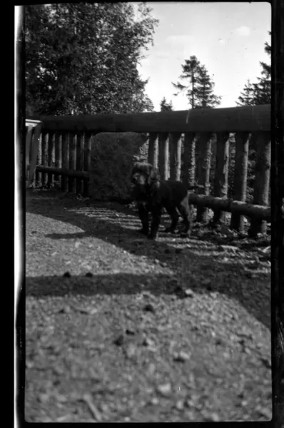 Hunden Rollo ved gjerde rundt terrassen på Villa Knyggen i Voksenlia, Oslo. Fotografert ca. 1920.
