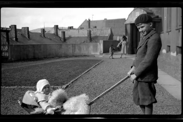 Rolf Sundt Jr. med broren Lars Peter i vogn på Heftyeterrassen 42, Oslo. Kvinne og barn i bakgrunnen.