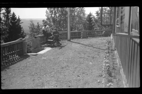 Fra terrassen til Villa Knyggen i Voksenlia, Oslo. I bakgrunnen antagelig Hilda Sundt og sønnen Julius samt Hildas far Julius Thaulow Aubert. Fotografert 1920.