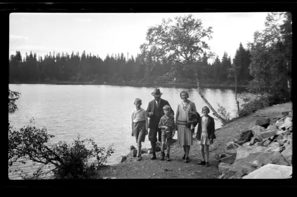 Turgåere ved Tryvann i Oslo. Fra venstre Julius, Finn, Rolf Jr., Hilda og Elsa Sundt. Fotografert 1928.