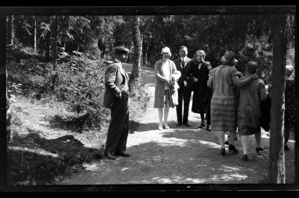 Venner på tur i Nordmarka. Rolf Sr. og Hilda Sundt til venstre for Johan og Agnes Buratti. Fotografert 1928.