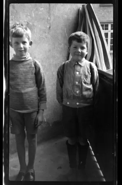 Rolf Sundt jr. og nabogutt Kåre Hemsen står sammen i oppgang E i Thomas Heftyes gate 42, Oslo. Fotografert 1928.